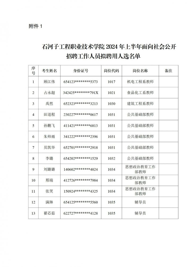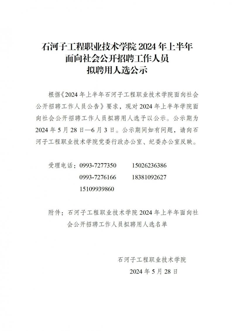 石河子工程职业技术学院2024年上半年面向社会公开招聘工作人员拟聘用人选公示