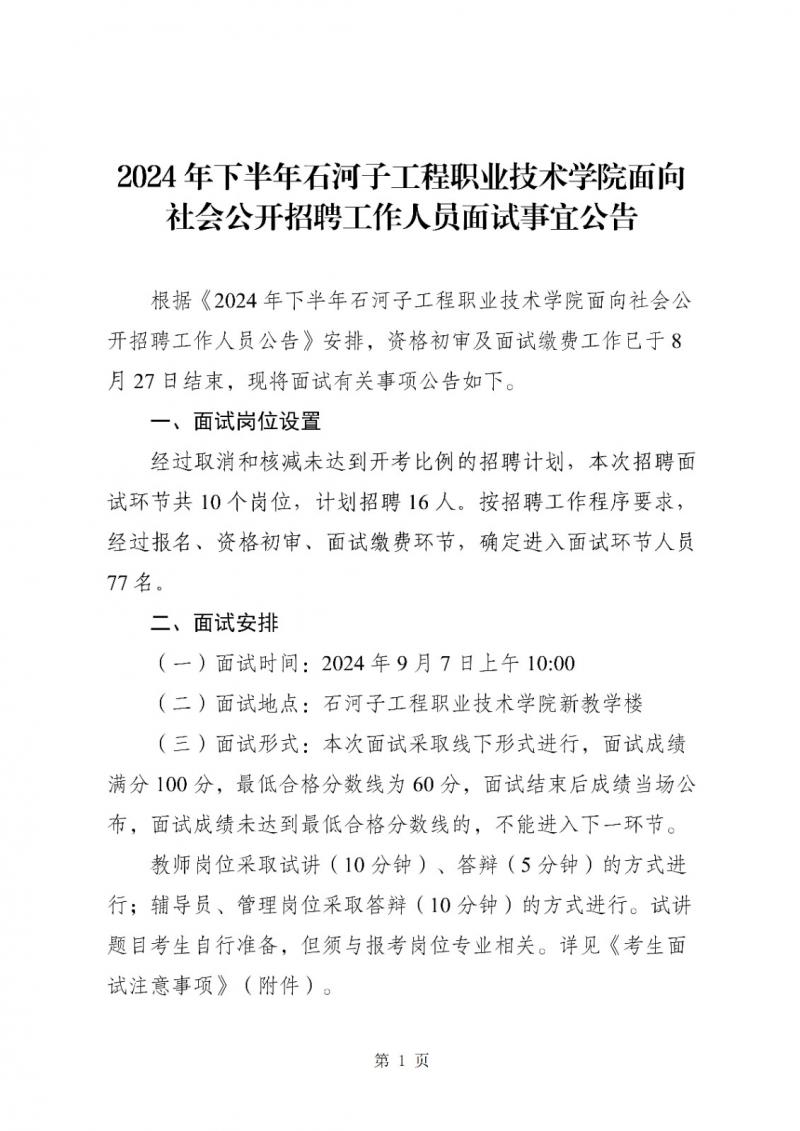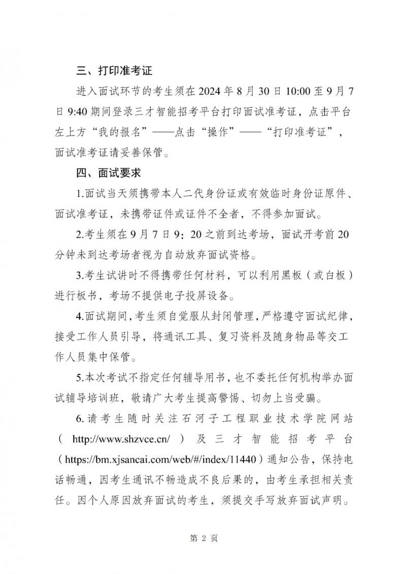 2024年下半年石河子工程职业技术学院面向社会公开招聘工作人员面试事宜公告(含附件).docx