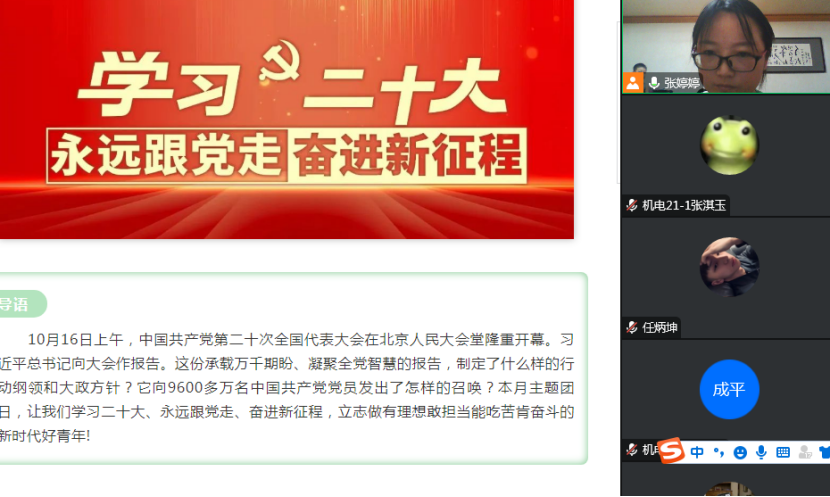 学院团委利用新媒体平台在深入学习党的二十大之际推出“我为祖国送祝福”“线上微团课”“青·听”FM 读书栏目。学院各系团总支也结合实际开展了“团员青年有话说”“主题演讲比赛”“争做新时代青年——职教学生心中的二十大”等主题教育活动,用团员青年喜欢的语言、形式和载体宣传好党的二十大精神,引导广大团员青年争当有理想、敢担当、能吃苦、肯奋斗的新时代好青年,在学院形成热烈、活跃的学习氛围。