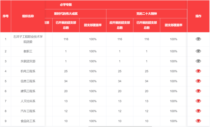 石河子工程职业技术学院团委通过发布《学习二十大、永远跟党走、奋进新征程》统一讲稿和课件,组织全院116个团支部,通过主题团课,带领支部团员青年将二十大精神学习感悟,实现“院-系-班”三级团员青年全覆盖,推动学习宣传不断走深走实,实现团支部覆盖率100%。