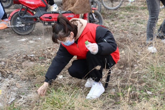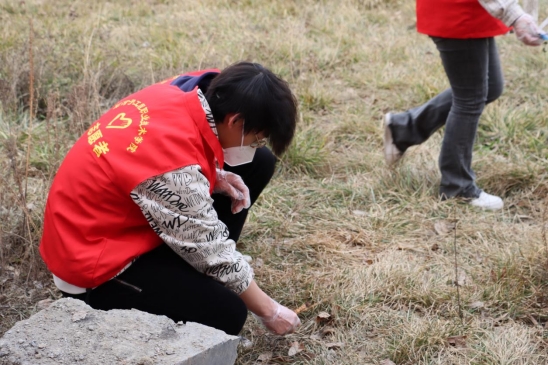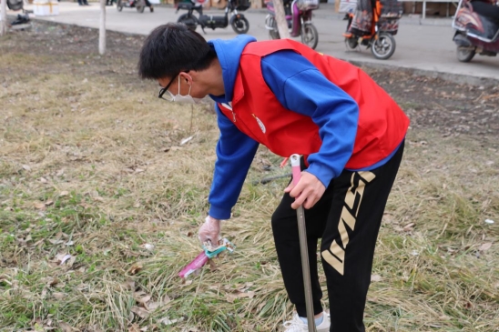 在户外捡拾垃圾时认真细致,不放过任何一个角落,对校门口小树林进行“地毯式”清理。