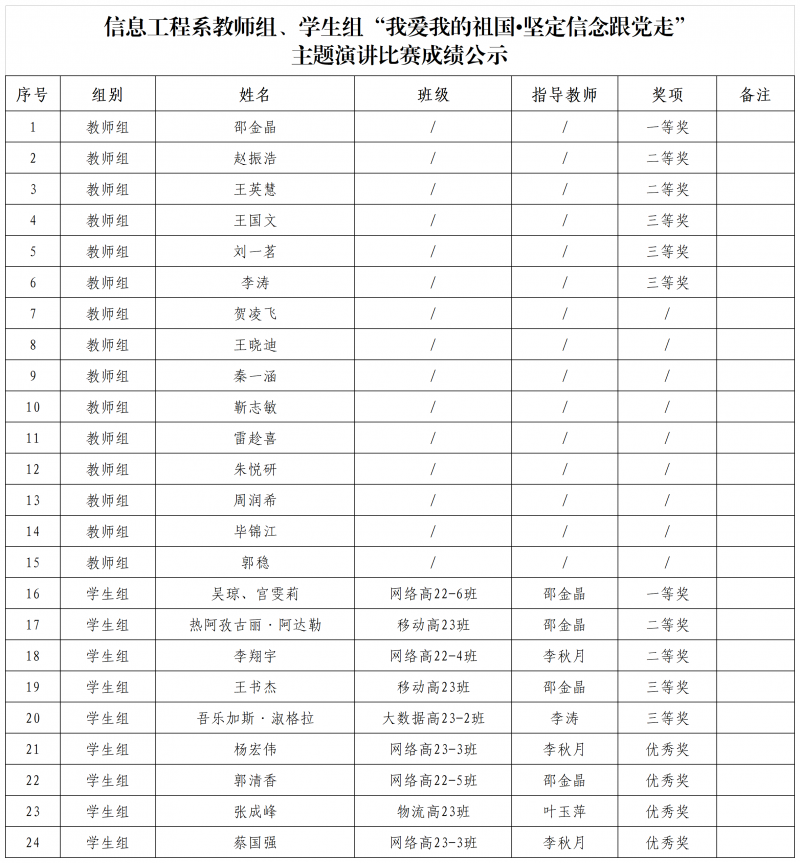 演讲比赛教师组评委由信息工程系教师李翔、胡金荣、颜莉、赵丽丽、徐秋萍担任,学生组评委由信息工程系副主任支琛琛、教师南洋、李秋月、学生会干部王欣玮、张鸿俊担任,本次比赛共计25名师生参加。