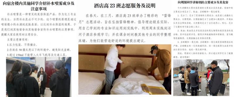 学院团委统筹各系团总支在“雷锋月”期间,结合专业特色开展了特色形式多样的志愿服务活动。如:酒店专业学子做出了“石河子市不同档次酒店推荐表”,从性价比和酒店的实际情况等做出分析,帮助来到石河子的游客更好地选择理想酒店。应化专业学子推出了“化妆品成分科普小贴士”,为各位女学生分析不同牌子化妆品中的化学成分,帮助大家更为健康地使用化妆品。特色志愿服务活动不仅帮助了身边的学生,更让不同专业的学生锻炼了专业知识的实际运用水平,起到了宣传职业教育实践性的作用。