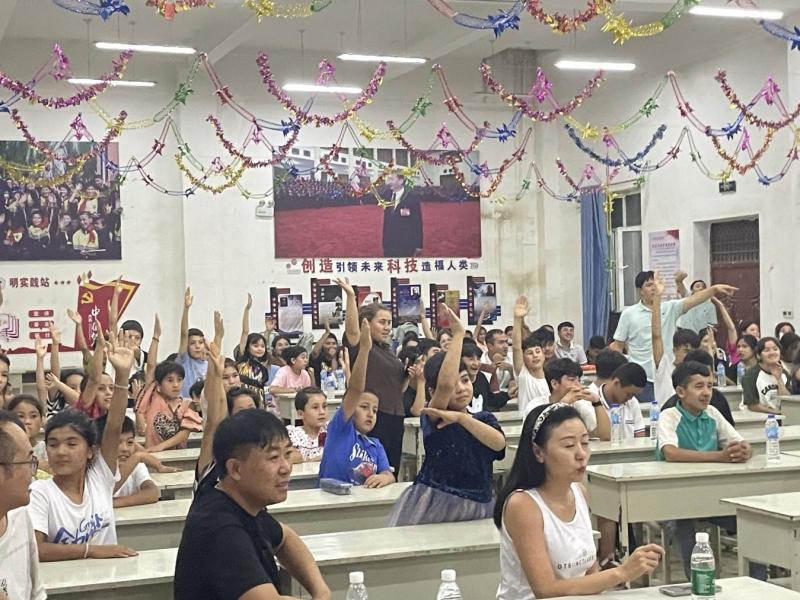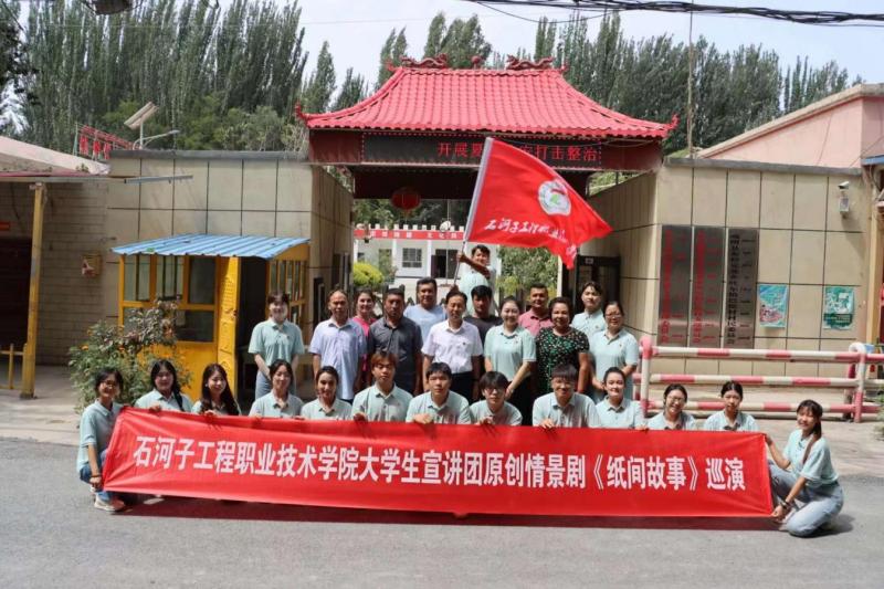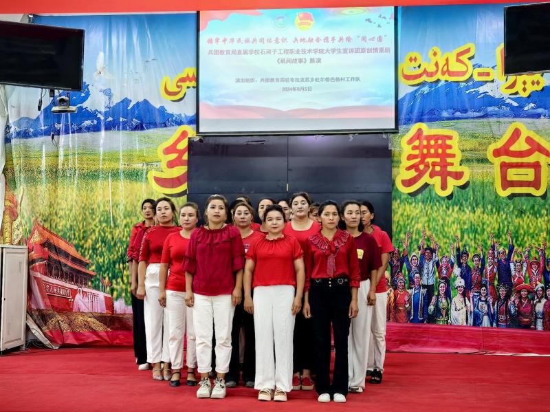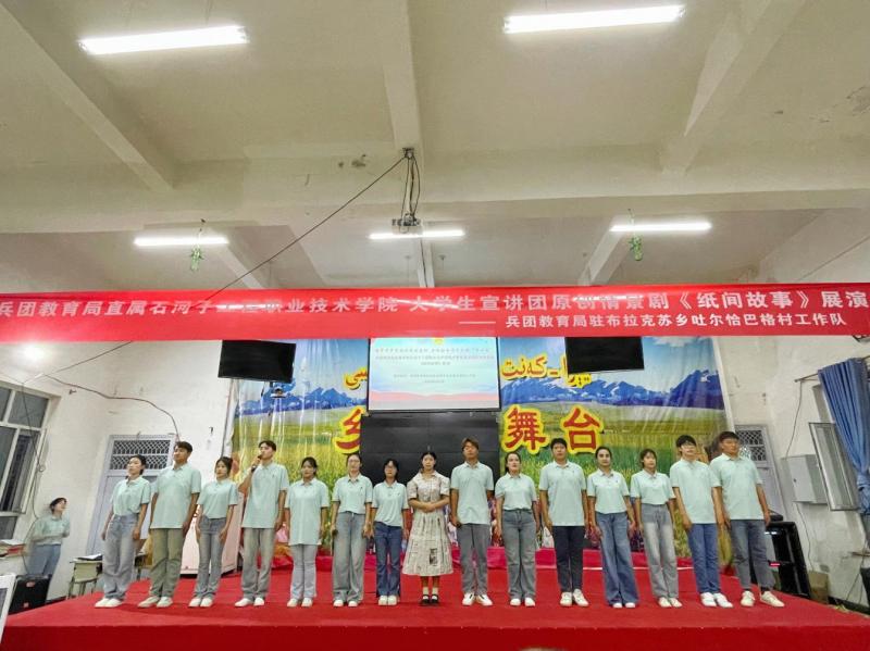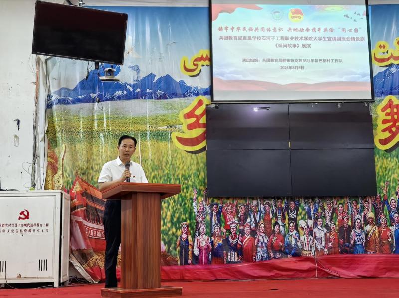 当晚21时,在吐尔恰巴格村的乡村大舞台,实践团队倾情演绎原创情景剧《纸间故事》。表演前,简基松同志在致辞中表示:“我们兵团教育局工作队驻村以来,始终坚持‘兵地一盘棋’思想,以铸牢中华民族共同体意识为主线,开展形式多样的兵地融合文化活动,实现资源共享、优势互补。吸引各族干部群众参与其中,促进各民族交往交流交融,推动兵地融合发展再上新台阶。”