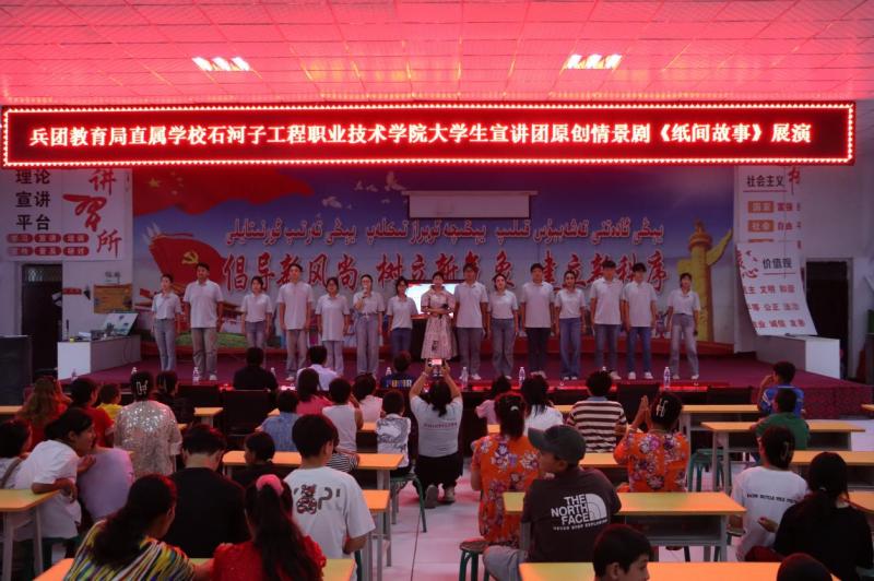 在活动中,实践团将我院原创情景剧《纸间故事》先后在喀什地区疏附县布拉克苏乡吐尔恰巴格村、克孜勒苏柯尔克孜自治州阿克陶县喀热开其克乡比纳木村、喀什地区疏勒县巴合齐乡喀勒克村、喀什地区疏附县布拉克苏乡代苏村4个乡村进行展演,并与村民进行互动、交流,以实际行动落实“文化润疆”工程。