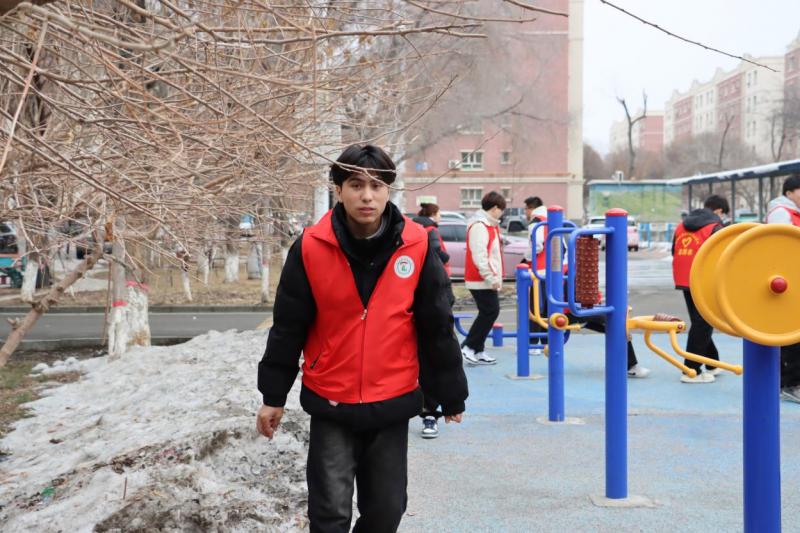 走出展馆,师生们化身“环保卫士”,在社区开展志愿服务活动。大家手持扫帚、垃圾袋等工具分组行动,重点清理积雪融化后绿化带里的隐蔽垃圾、擦拭公告栏等公共设施,帮助社区对卫生死角进行清洁打扫,让社区面貌焕然一新。