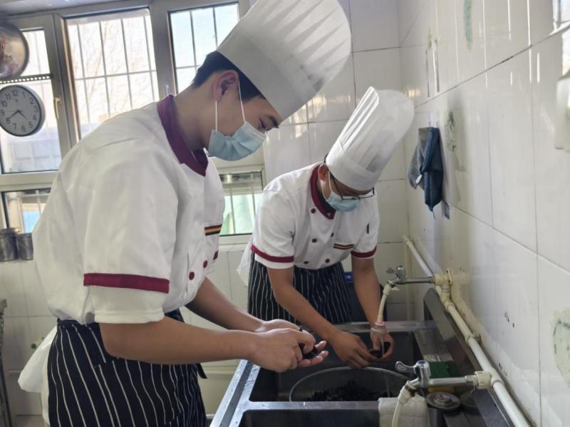 ? ? ? ?志愿者们走进幼儿园食堂后厨,参观完毕后,有食品安全健康证的志愿者与厨师们并肩作战,共同准备孩子们的甜点和晚餐。烹饪高24班的学生马锦涛在参与活动时说:“以往我只是在实训室练习烹饪技巧,这次在幼儿园食堂的实践经历,让我直观感受到对食材选择的严谨和对烹饪水平的严格要求,要不遗余力地做出健康、营养的食品。”这次志愿服务不仅让烹饪专业的学生们将所学技能与实践紧密结合,更是一次检验职业技能、拓宽视野的宝贵机会。