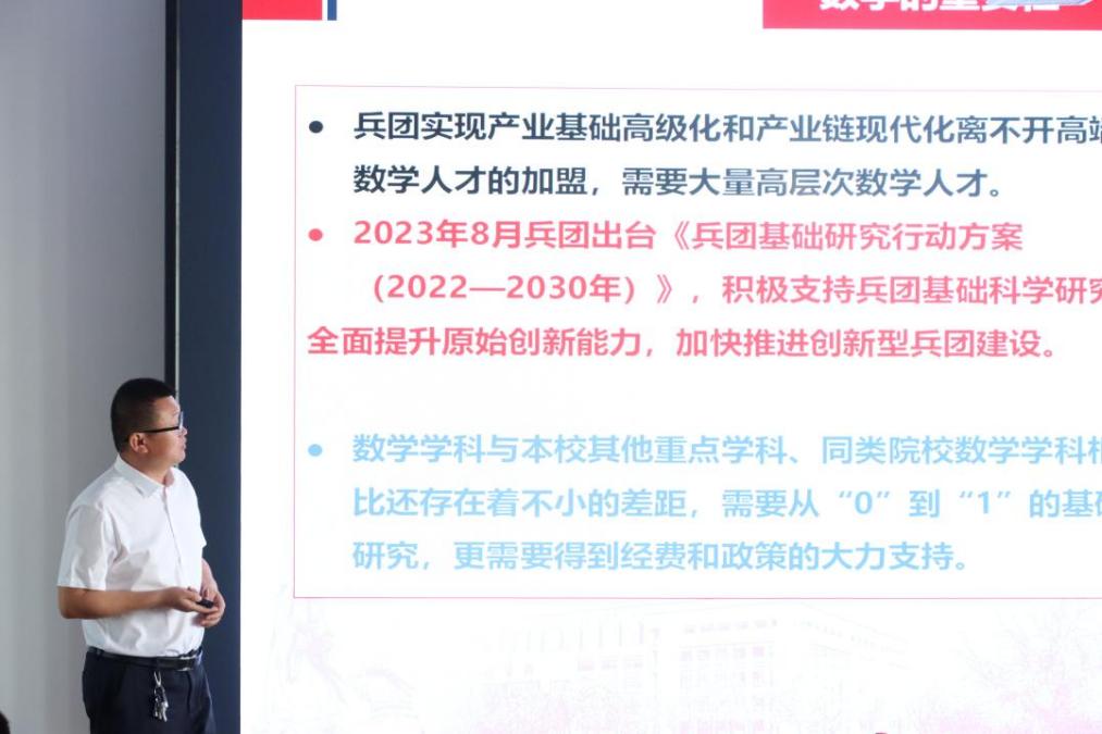 韩志全教授从兵团实现产业基础高级化和产业链现代化离不开高端数学人才作为切入点,对从“0”到“1”的学科建设过程进行梳理,以石河子大学数学建模团队的发展为例,鼓励我院师生勇于进取,大胆实践。